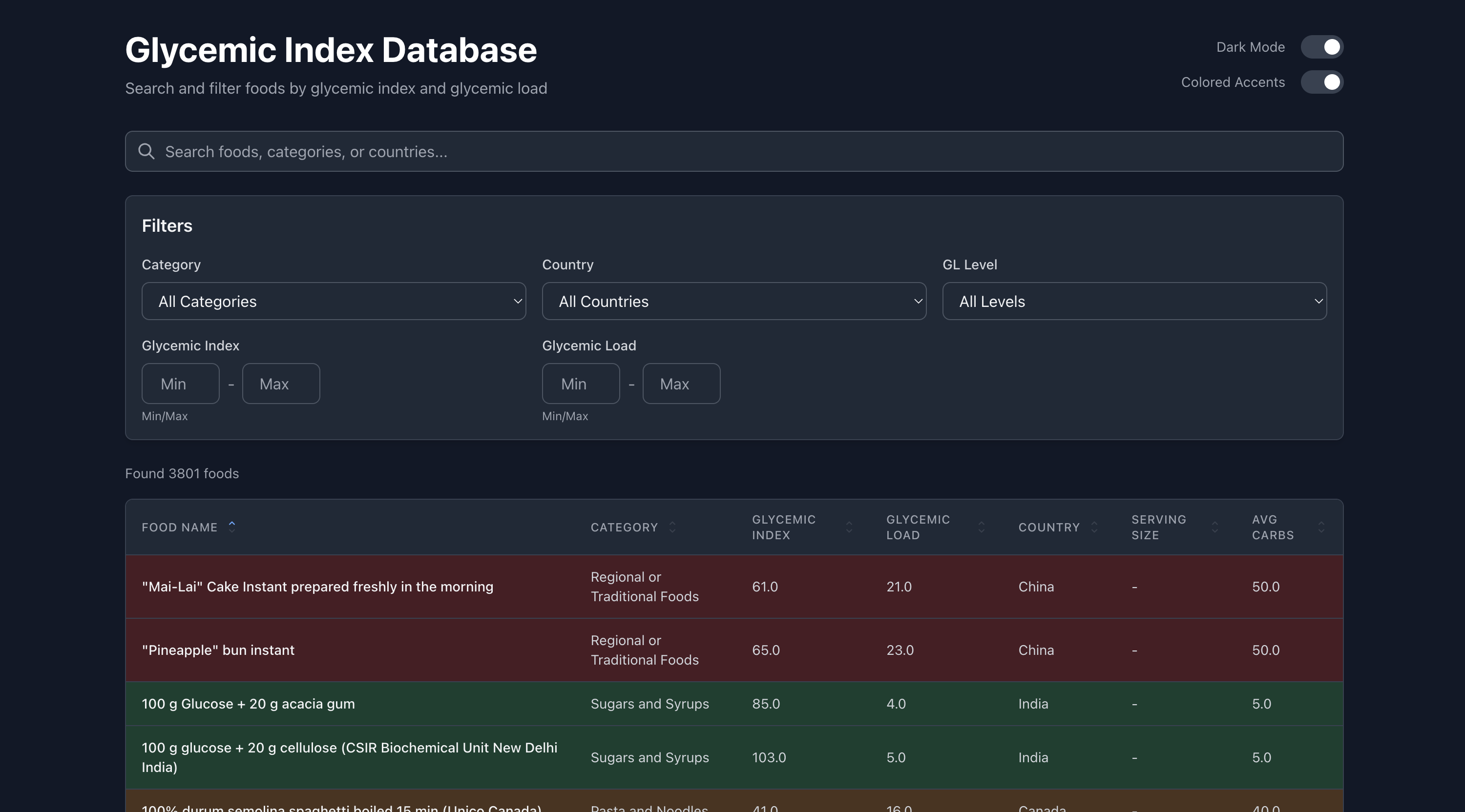 An easily searchable, clear and intuitive database for looking at different foods' glycemic index and glycemic load with advanced filtering capabilities